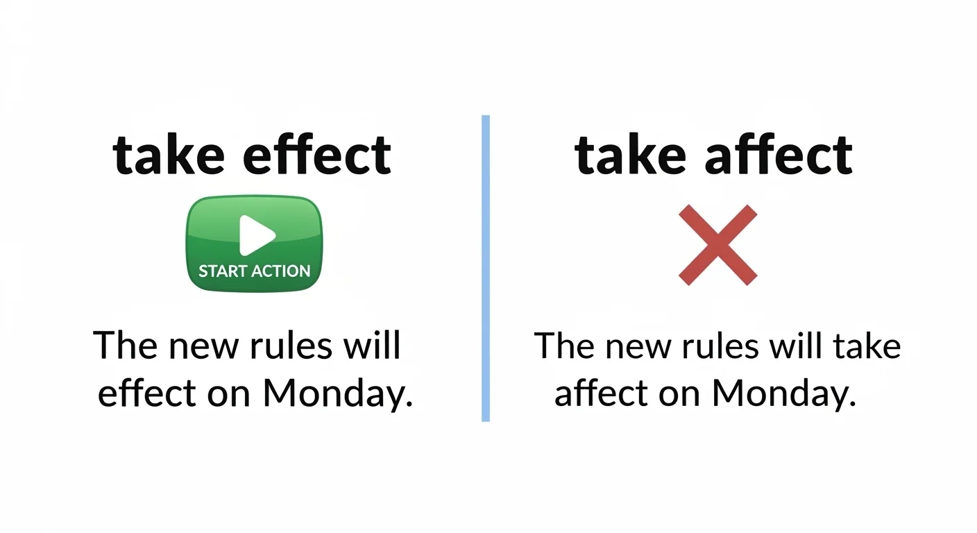 “Take effect” and “take affect” often confuse learners because “effect” and “affect” sound almost the same. When writing quickly, it is easy to choose the wrong word.